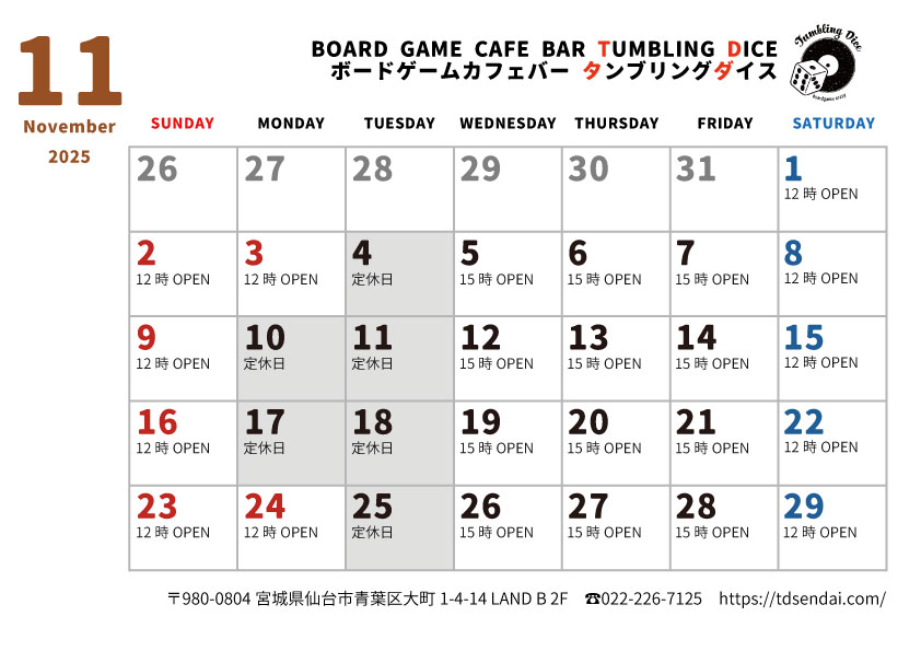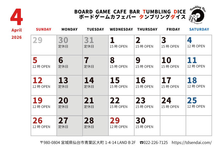 ボードゲームカフェ タンブリングダイスは、ドイツゲームを中心に世界中のボードゲームで遊べるカフェバーです。杜の都と言われる宮城県仙台市。カフェやバーが点在する青葉区大町の肴町公園の隣のビルの2Fに、2017年4月「大町本店」がオープンしました。