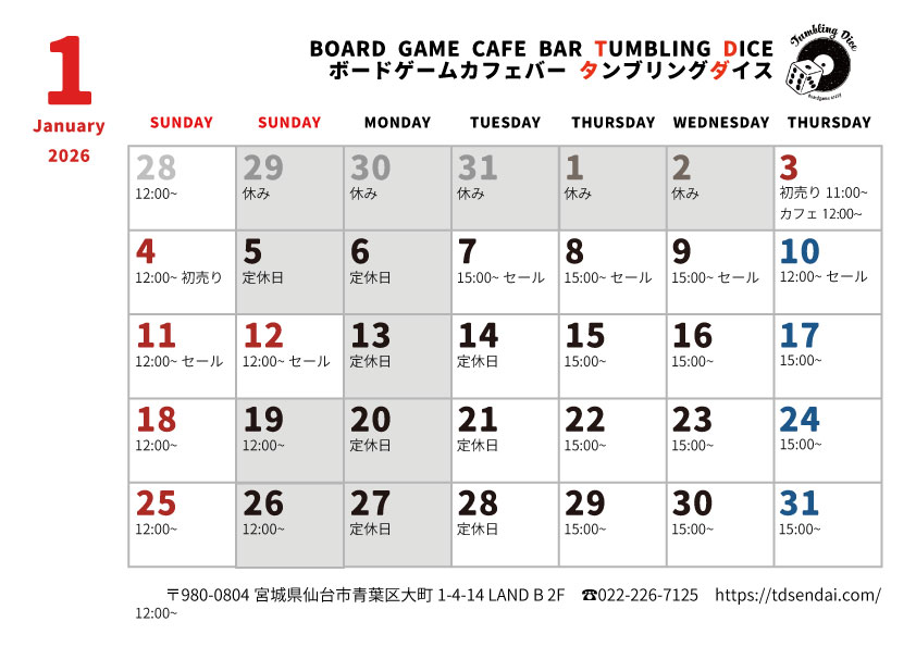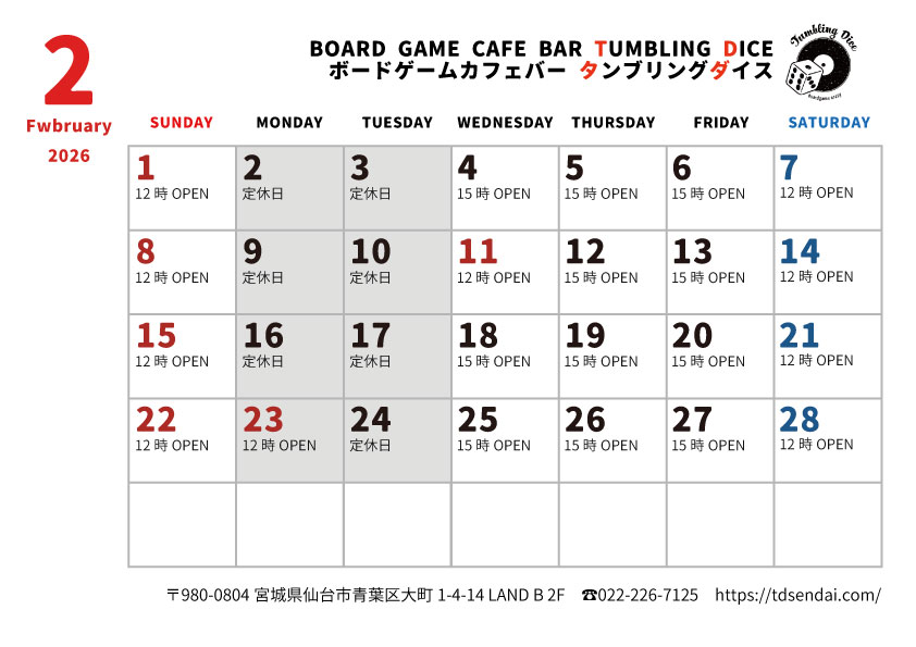 ボードゲームカフェ タンブリングダイスは、ドイツゲームを中心に世界中のボードゲームで遊べるカフェバーです。杜の都と言われる宮城県仙台市。カフェやバーが点在する青葉区大町の肴町公園の隣のビルの2Fに、2017年4月「大町本店」がオープンしました。