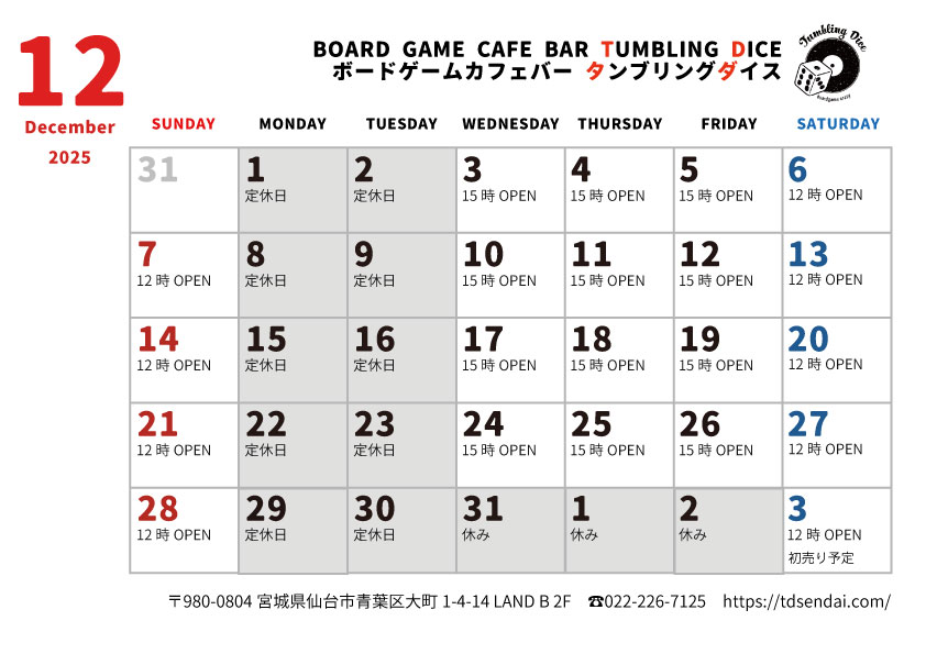 ボードゲームカフェ タンブリングダイスは、ドイツゲームを中心に世界中のボードゲームで遊べるカフェバーです。杜の都と言われる宮城県仙台市。カフェやバーが点在する青葉区大町の肴町公園の隣のビルの2Fに、2017年4月「大町本店」がオープンしました。